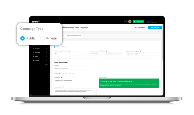 Choose between 'public' and 'private' for your campaign. Public campaigns will publish all reviews to your Feefo merchant page and send them to Google. Private campaigns withhold reviews from the merchant page until switched to public, at which point all reviews will be published.