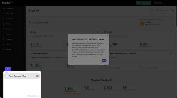 From your dashboard, you can easily access important information at a glance. Keep track of uploads, emails, and monitored reviews right here, while the graphs below provide a quick overview of your feedback. Stay informed and in control with this convenient feature.