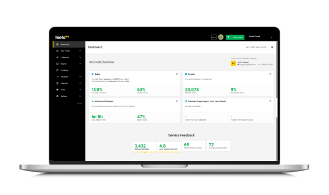The Feefo Hub is the control centre for everything. The intuitive and user-friendly dashboard gives you easy access to all the stats you need on an everyday basis, and the handy features available from within the Hub mean you can really make the most out of their reviews. Manage sales data, create campaigns, view all feedback, respond to reviews and access automated reports - all from the Feefo Hub.