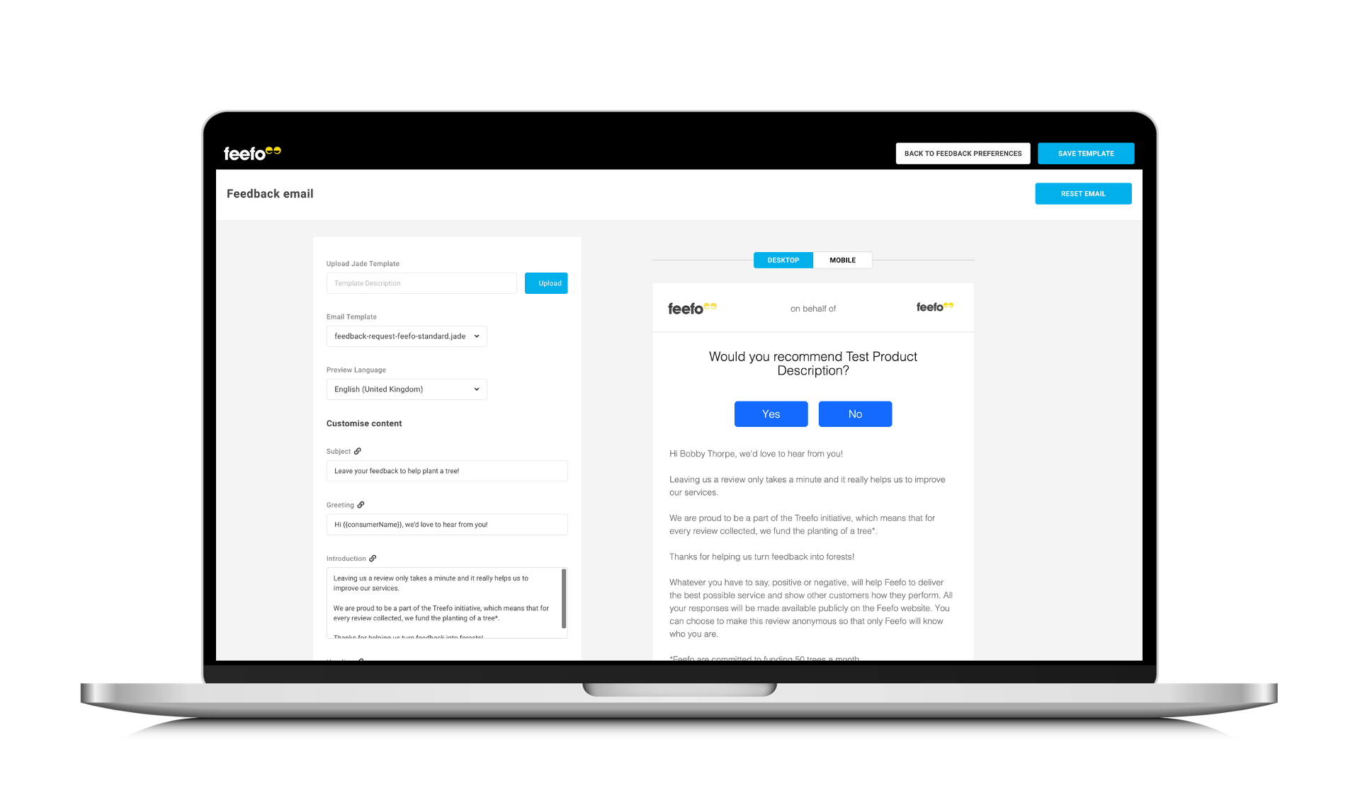 Before making any changes, ensure the correct 'Preview Language' is selected from the drop-down menu, which lists all supported languages by Feefo. If you serve multiple countries, update the language templates accordingly to ensure the emails are received as intended. You can specify the language for the Feedback Request by including 'locale' in your sales file upload.