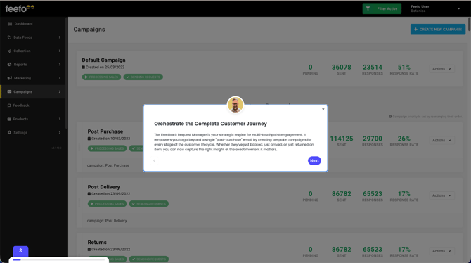 The Feedback Request Manager, previously referred to as the 'Campaign Manager Tool' (CMT), empowers you to manage multiple campaigns within the Feefo Hub. This feature enables the creation and delivery of distinct feedback requests at various touch-points along the customer journey.