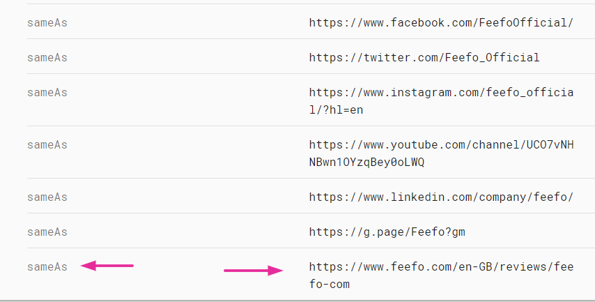 The "sameAs" attribute allows you to group all external pages containing your brand information, such as Facebook, Instagram, LinkedIn, and other branded social accounts. This helps Google associate these pages with your brand, ultimately benefiting your Feefo review page's rankings for branded keywords.