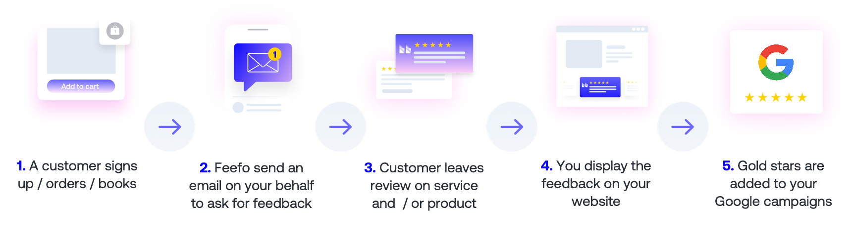 Feefo works by sending post-purchase invitations to customers to leave verified reviews, which are then published to help businesses build trust and gain insights.