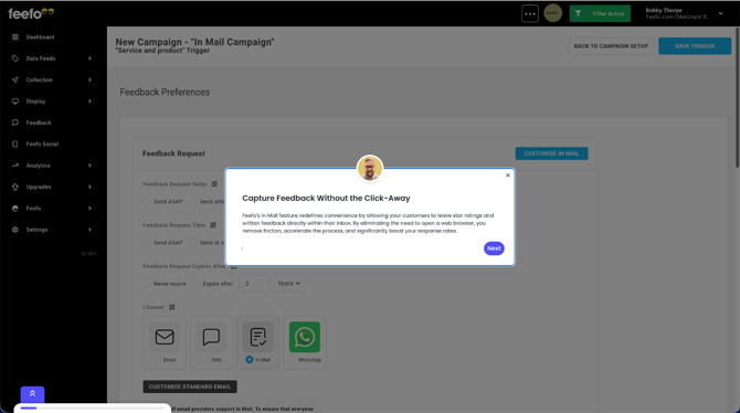 - With In Mail selected as you channel click Customise In Mail in the top-right corner of the Feedback Request section.