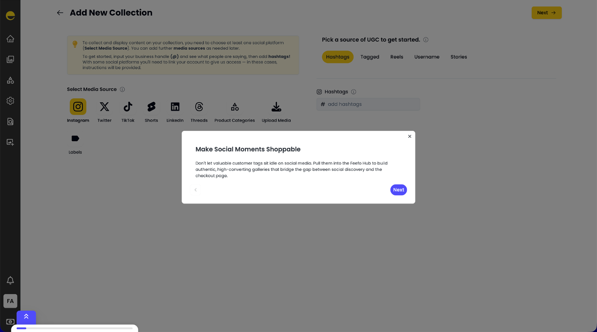 In the pop-up, add the name of your new collection (e.g., Feefo) and select the method using which you want to fetch the UGC content. i.e for Instagram you have Hashtag, Username (or Handle), Tag, and Reels.