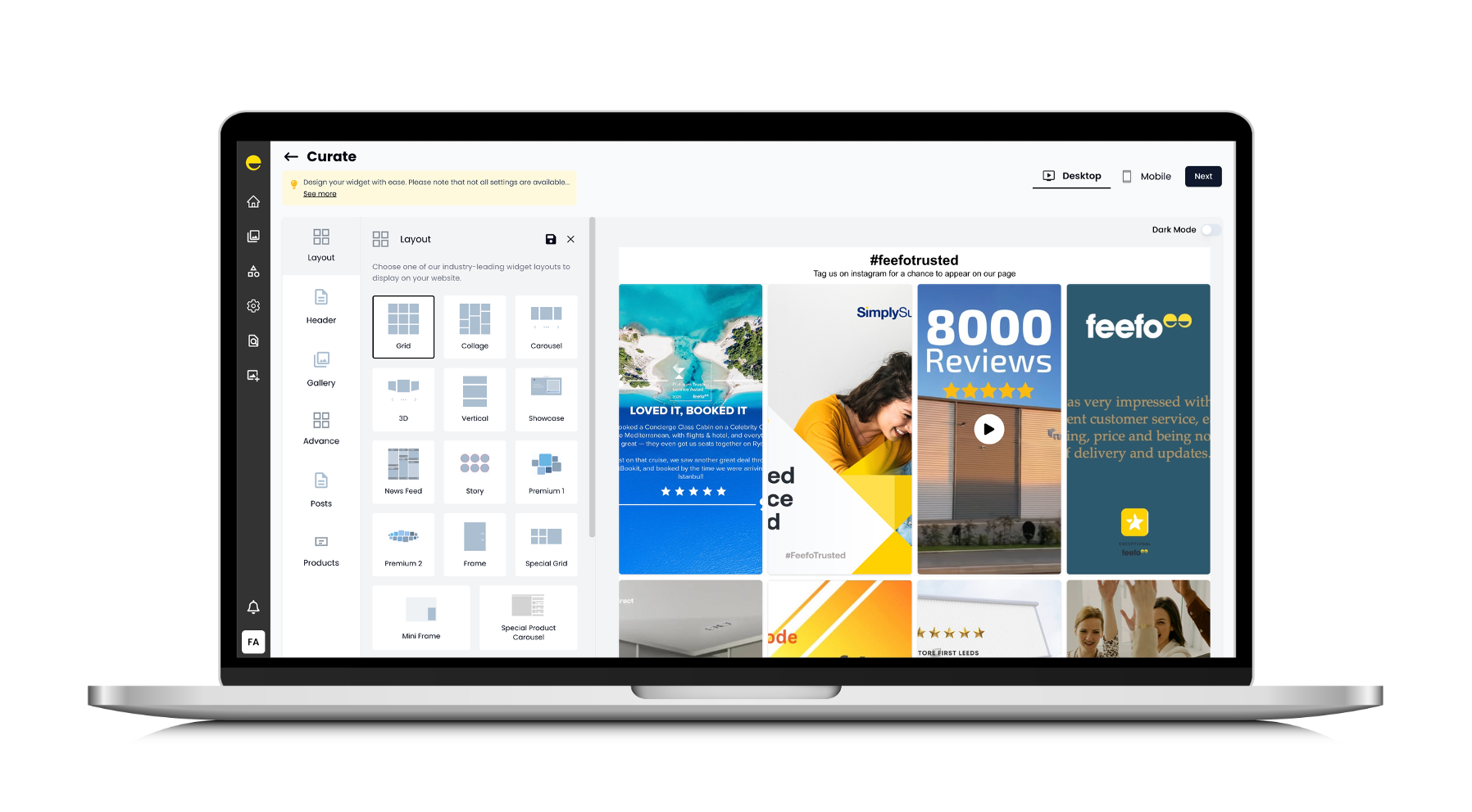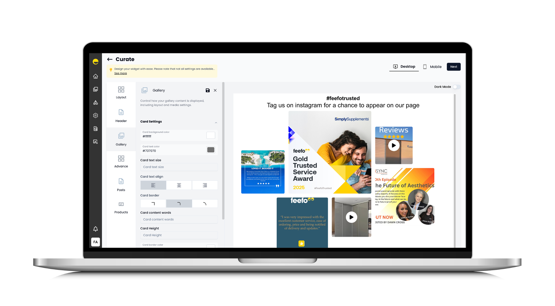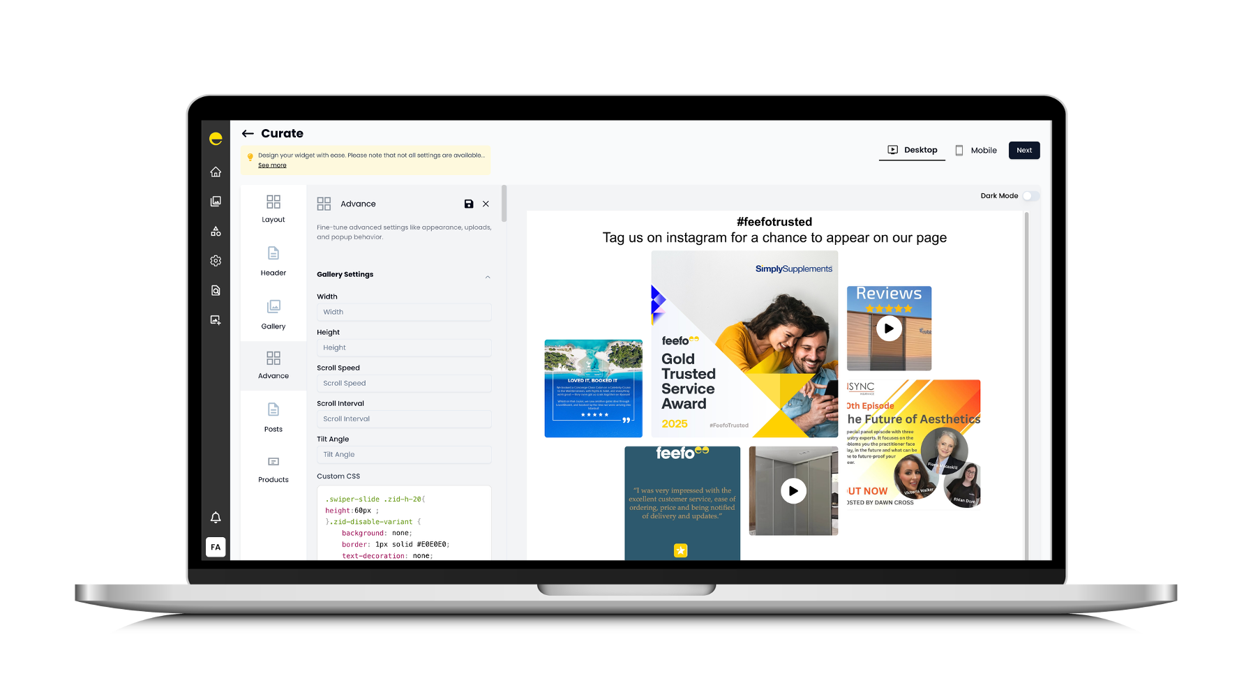 Fine-tune the appearance and functionality of your collection. You can adjust the size, scroll speed, and style of your layout, as well as remove the Feefo watermark if you want.