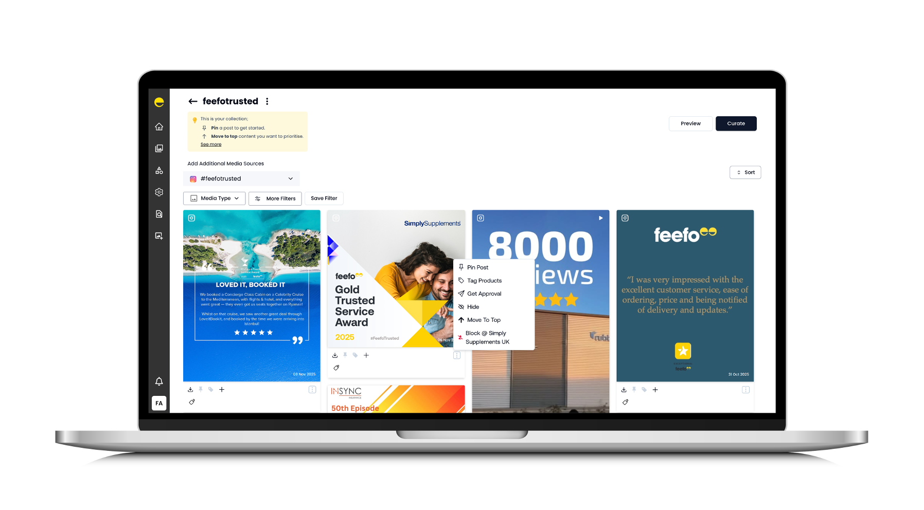 Once you've curated a compelling collection centred on Feefo, the ability to customise it to your liking becomes effortlessly attainable. Simple steps allow you to make modifications with ease. These edits encompass adding new content, tagging products, pinning posts, hiding specific entries, seeking user approval, and sorting posts that may contain profanity. Unleash your creative prowess and transform your Feefo Social collection into a truly captivating experience.