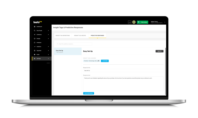 The predictive response that you create acts as a template for responding to feedback. Be sure to use a title that will help you to pick out the response from a list, as you may find that as time goes on you’ll want to add more and more insight tags to this list. When you’ve entered a response title, response text, and you’ve applied the relevant value(s) to that response, go ahead and select ‘Save response’.
