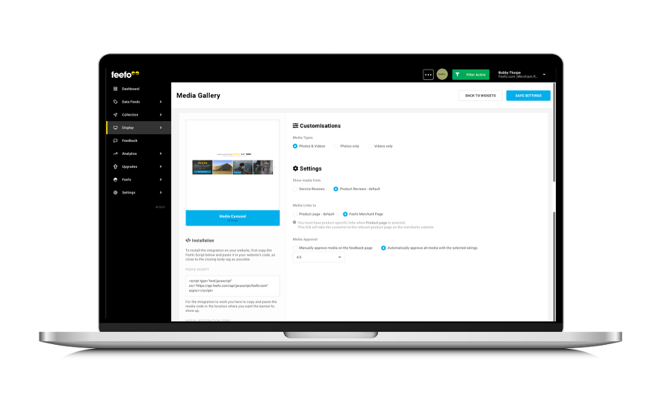 Once you have some user-generated media uploaded, to publish the content alongside customer reviews, enable 'Display customer uploaded media' in 'Settings > Feedback Preferences' - Please note that this setting will publish all media files in the Media Gallery. If you would like to highlight certain media files as part of your Feefo integration, you will need the optional product Media Integration.