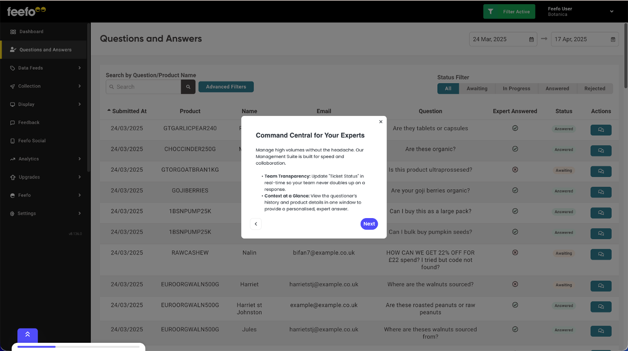 Feefo's Q&A Dashboard provides businesses with a comprehensive set of metrics and insights to track the performance and conversion rates of customer questions and interactions. These metrics offer valuable data points to understand customer engagement, response effectiveness, and ultimately, drive business growth.