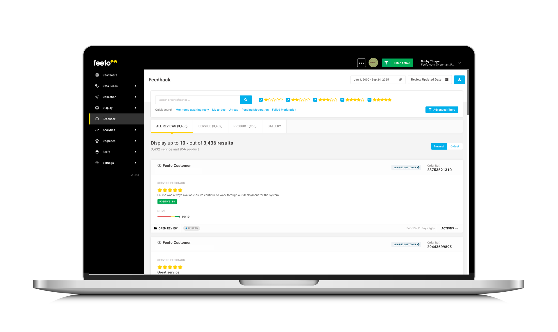 The Feedback Dashboard allows you to manage customer reviews across services and products. Use it to moderate reviews, respond to customers, and organise feedback using insight tags.