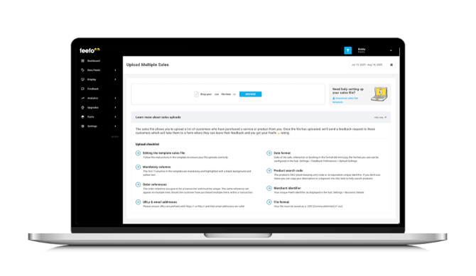 To get started, Feefo offers a sample sales file that you can download directly from the Feefo Hub. Follow these steps to access the sample sales file: