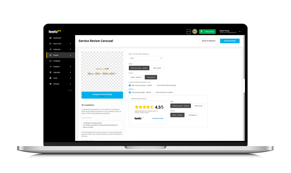 Finally, you may wish to consider the timeframe over which the reviews are sourced for displaying in the carousel. This can be defined in 'Display > Widgets Gallery > Settings > Service - Rating Timeframe':
