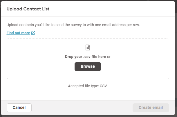 Navigate to Surveys, choose an existing survey (or create a new one) and select the Email tab to upload your CSV file.