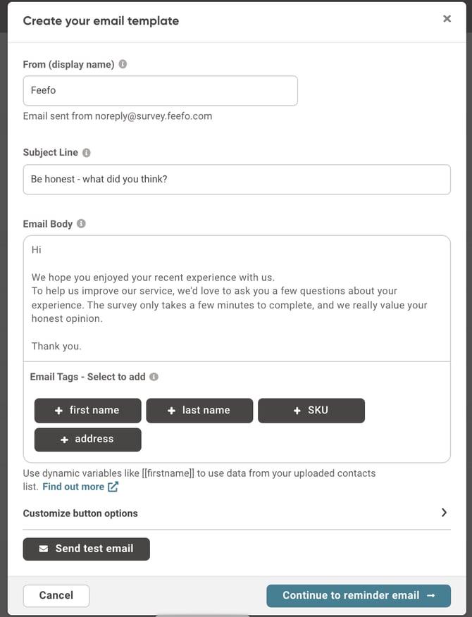 This option will be displayed during the email configuration process and will allow you to create personalised emails containing corresponding customer data e.g. name, company, brand or product title, depending on your preferred feedback topic.