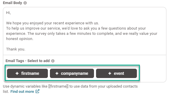 You can add dynamic variables to the email body by clicking the tag icon and inserting them wherever needed.