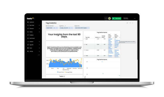 | Tag Performance Table | Shows high-level data: Tag Value, Review Count, Average Rating, Top 3 Positive Comments, and Top 3 Negative Comments. You can drill down into more detailed charts from here. |