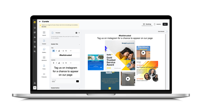 The Header Tab allows you to customise the title, subtitle, and primary call-to-action (CTA) buttons displayed prominently at the top of your Feefo Social gallery. Configuring the header effectively helps brand your gallery and encourages users to follow your social channels.