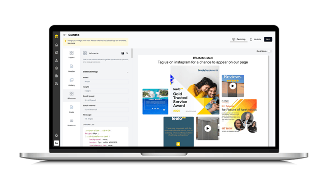 The Advanced Tab provides granular control over the general appearance, behaviour, colours, and user-generated content (UGC) submission experience of your Feefo Social gallery. These settings are crucial for integrating the gallery seamlessly into your existing website and brand design.