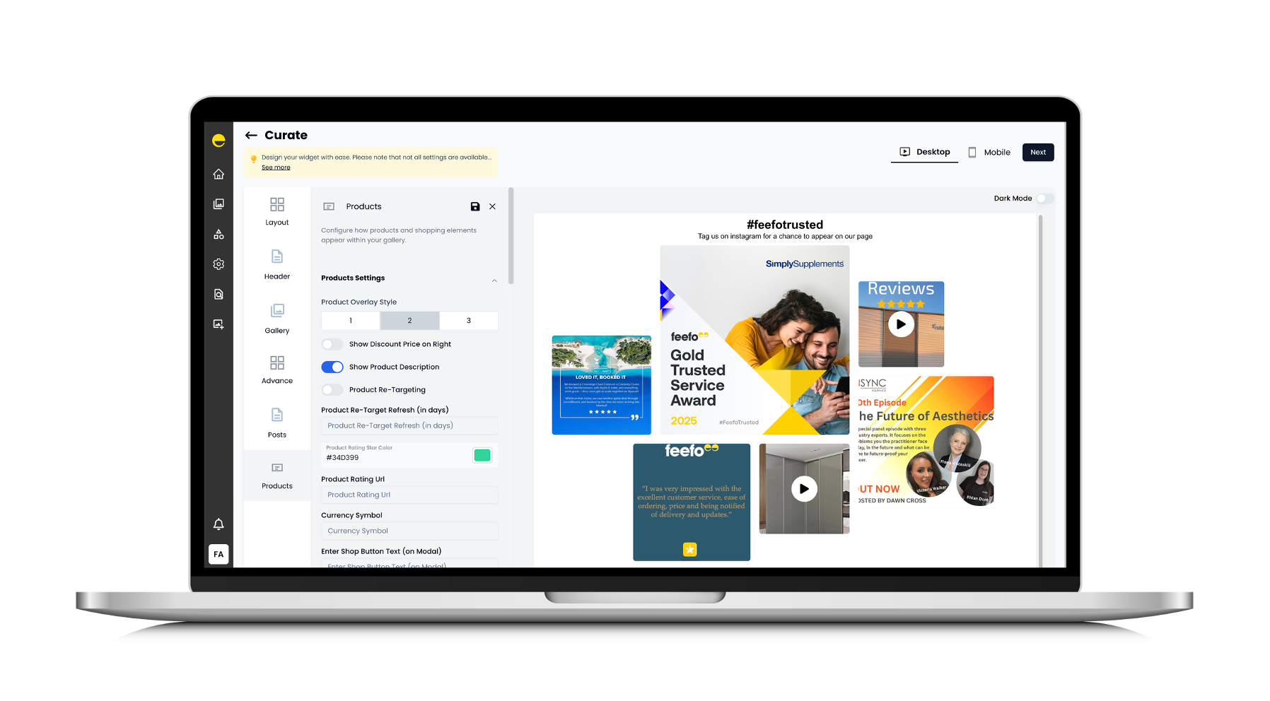 This article guides you through configuring the display and functionality of products and shopping elements within your Feefo Social gallery. These settings are crucial for optimising your user's shopping experience, controlling the visual look of product overlays, and managing conversion pathways.
